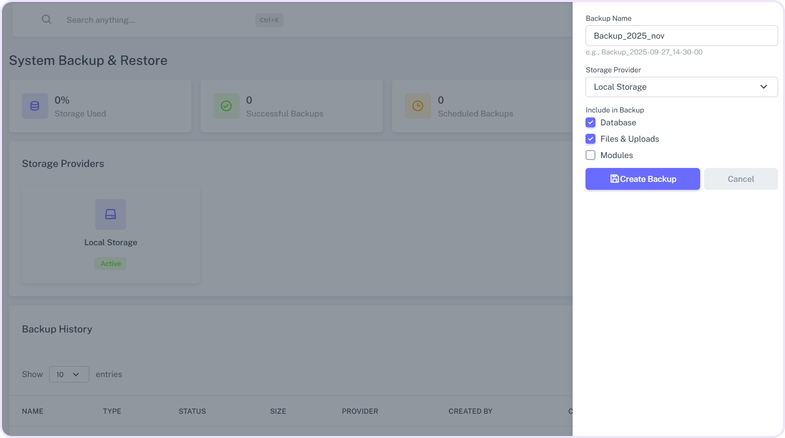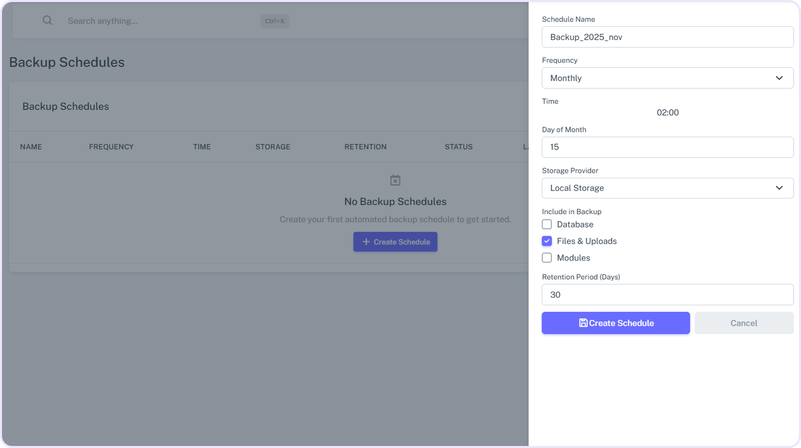 • Additionally, select exactly what to include database, files, uploads, or modules for more precise backups.