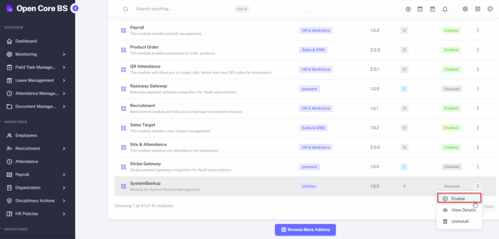 Step 7: Locate the uploaded file and click the three dots under the Actions column. Select the “Enable” button.