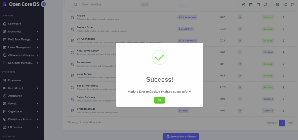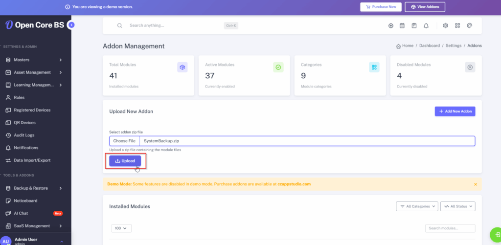 Step 4: Go to your admin / superadmin dashboard and click on the addons section located at the top right navigation bar.