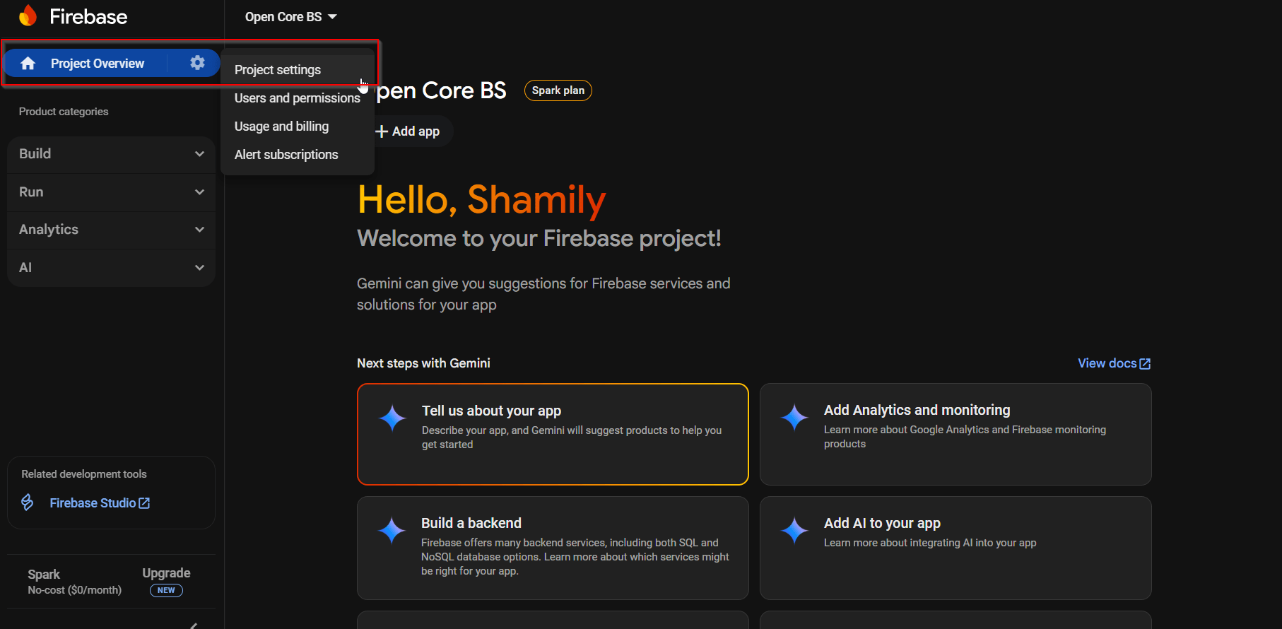 Step 5: Once the project is created, go to the Firebase dashboard screen. Then click the settings gear icon in the top left corner and select the project setting.