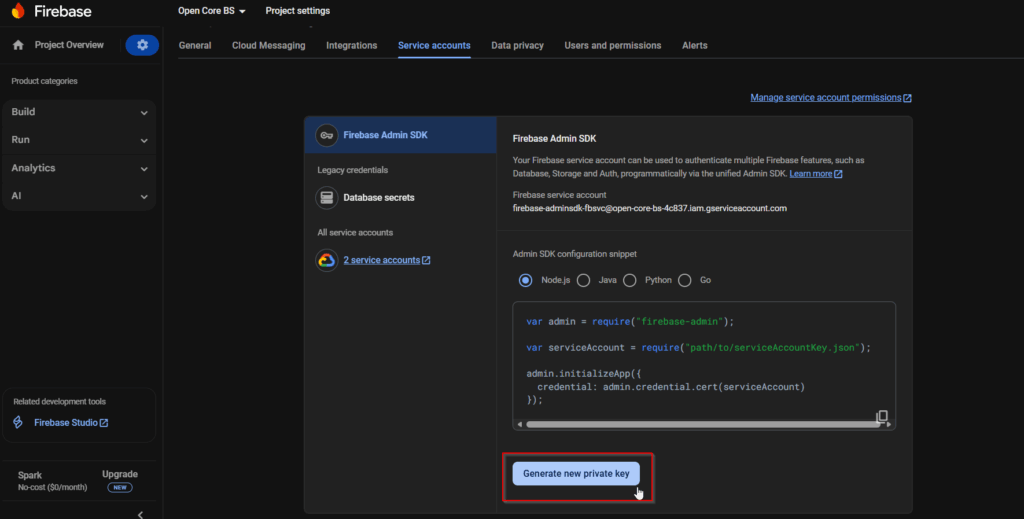 Step 6: In the project settings select the Service accounts tab and click Generate new private key.
