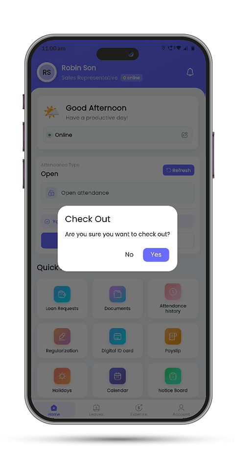 Enable employees to check in and check out using registered facial recognition in the Employee App, ensuring a secure and seamless attendance process.