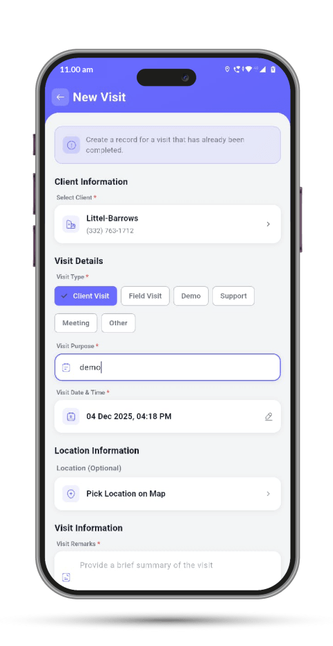 Absolutely. You can add, update, and manage client details, track visit history, record meeting notes, and maintain complete customer interaction records.