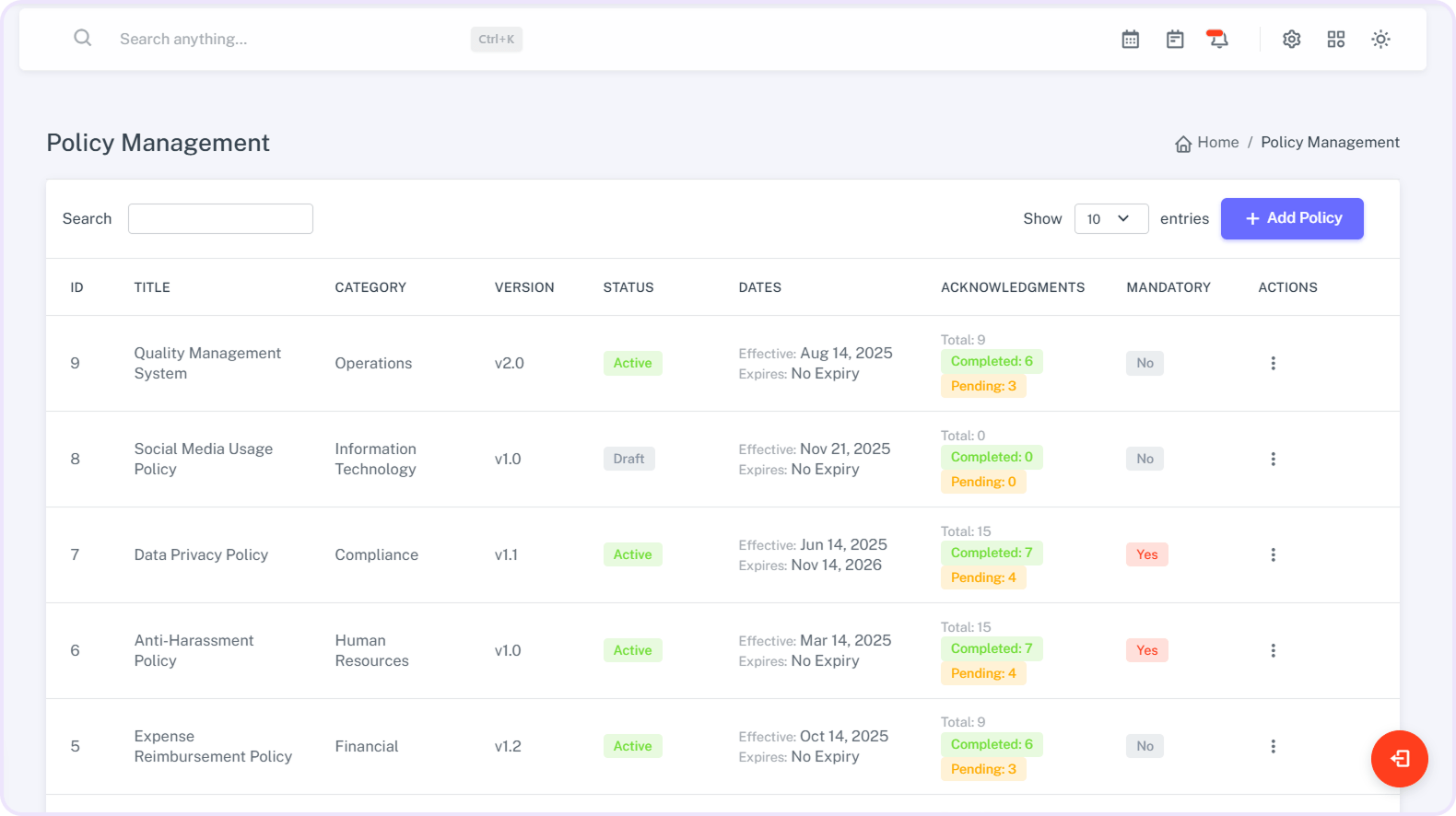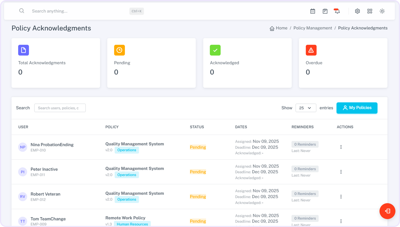 View a clear list of all pending and completed acknowledgements.