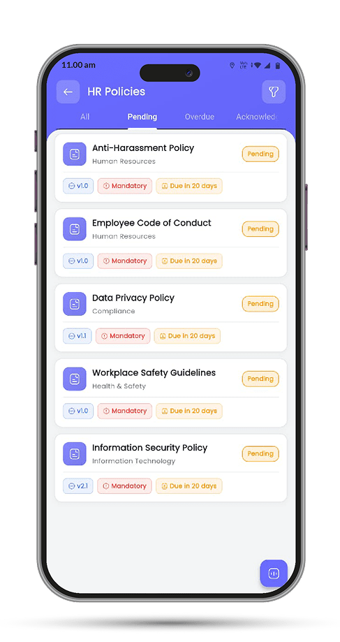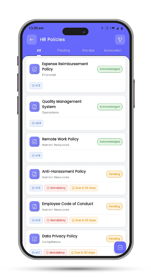 Allow employees to acknowledge assigned policies directly from the mobile app.