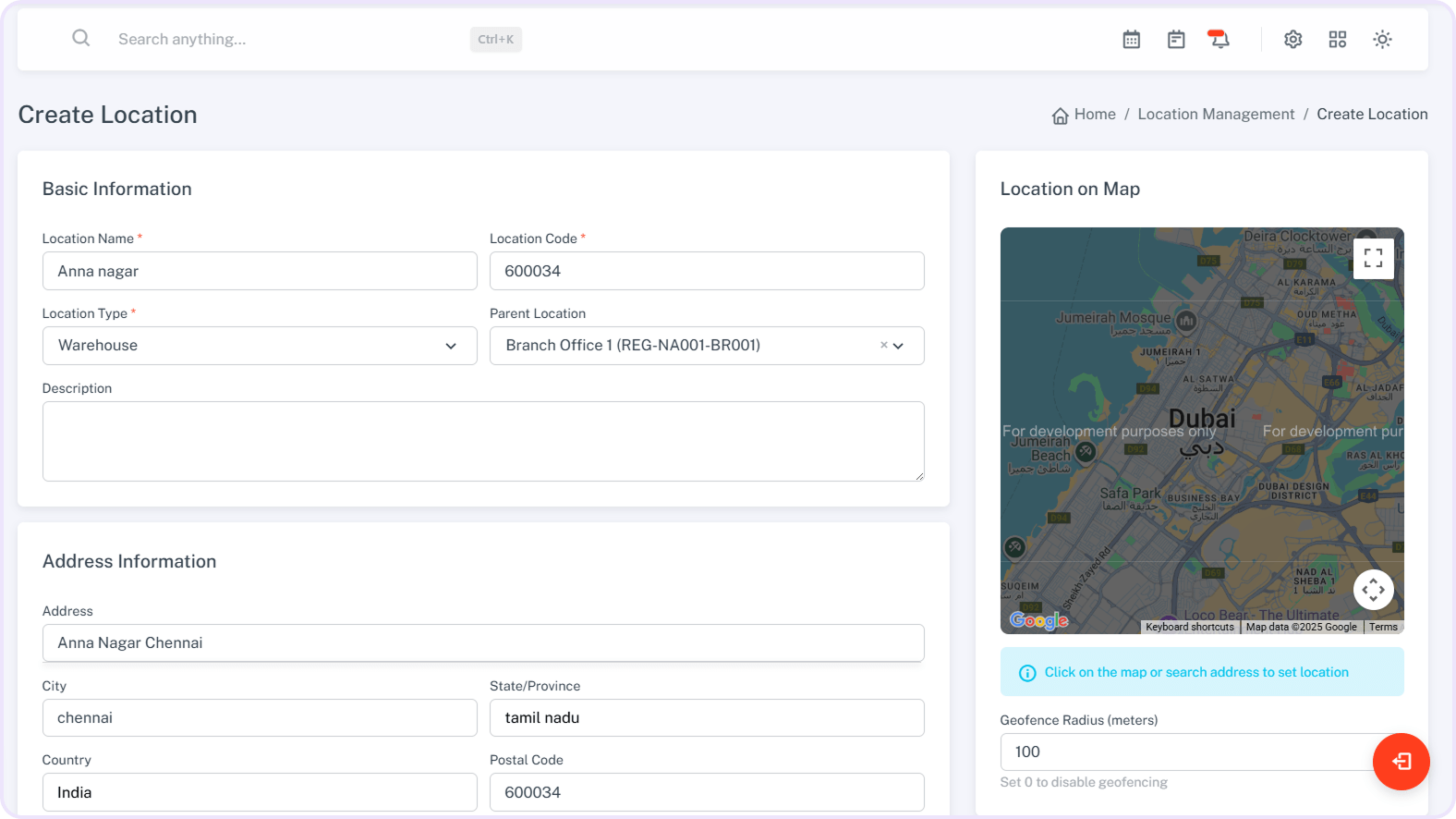 Create and manage locations with basic details and address info.